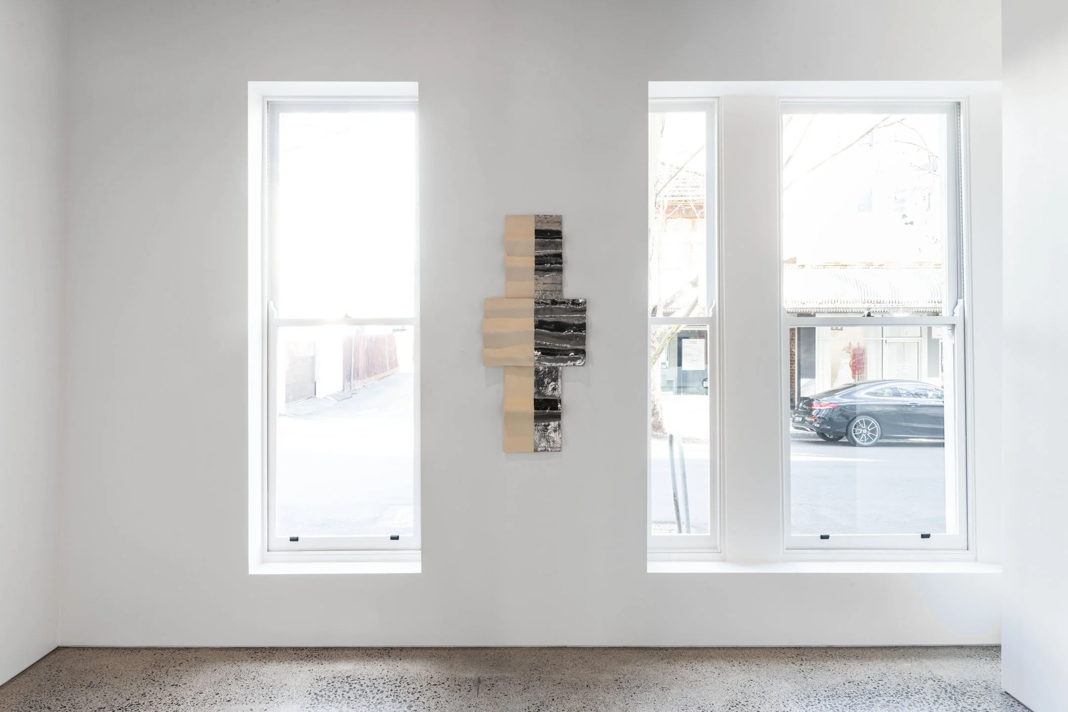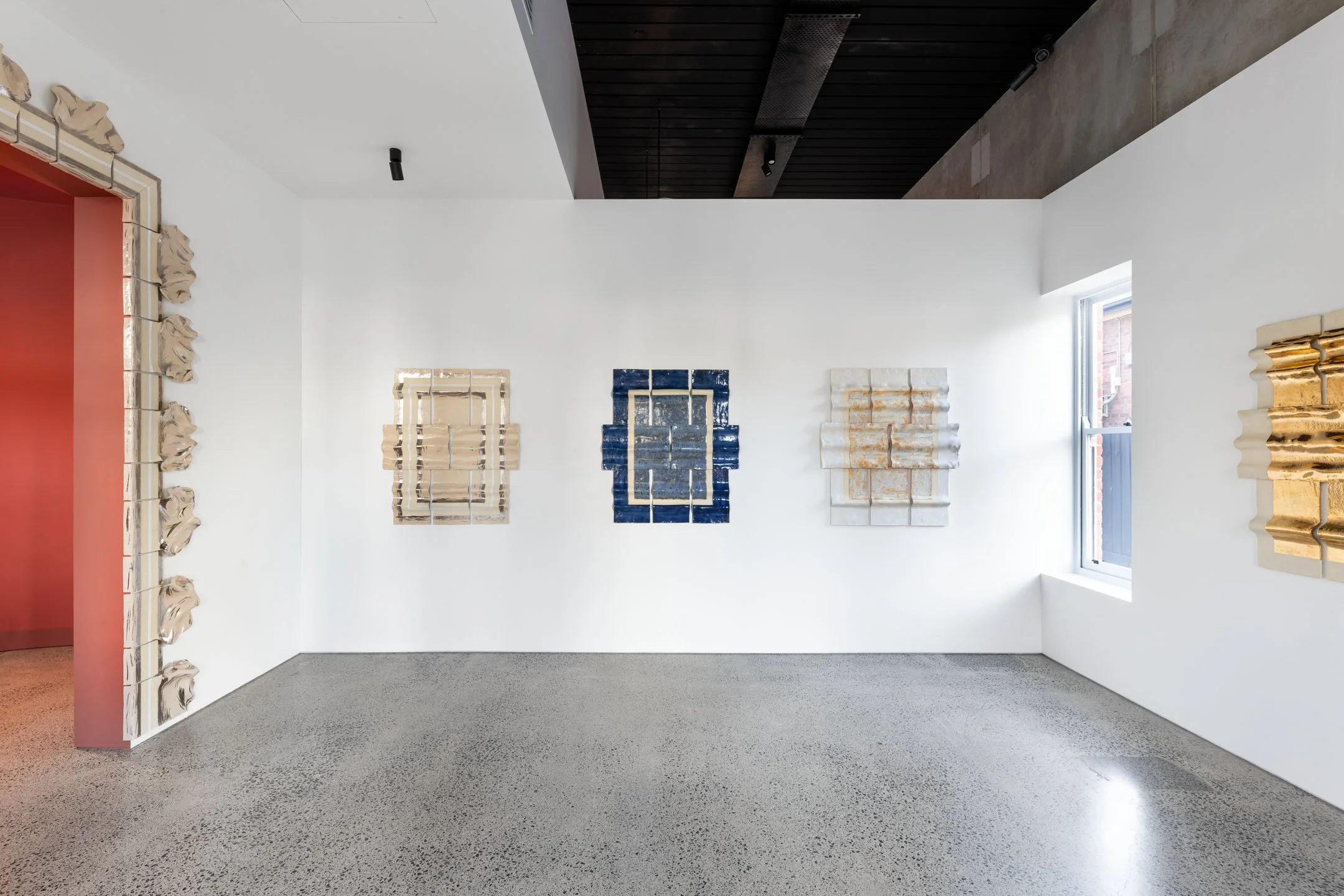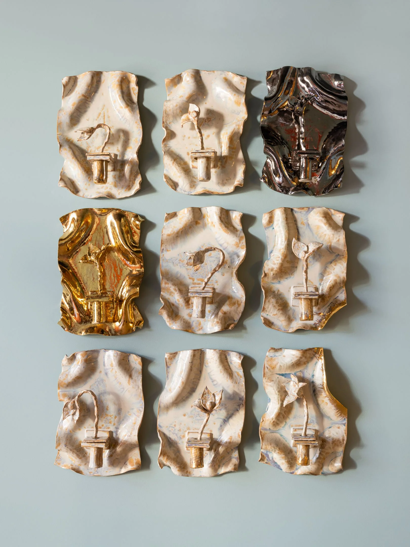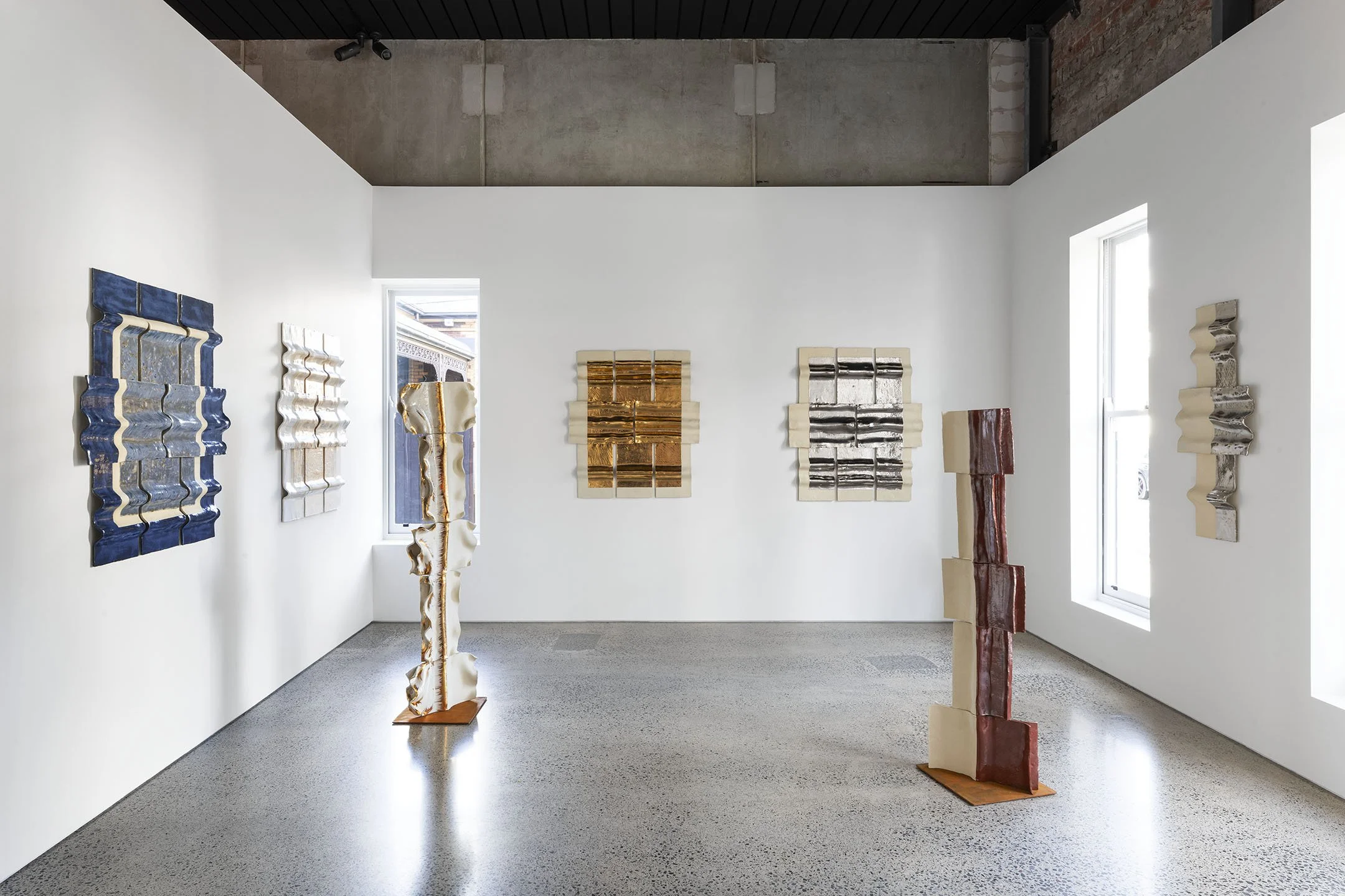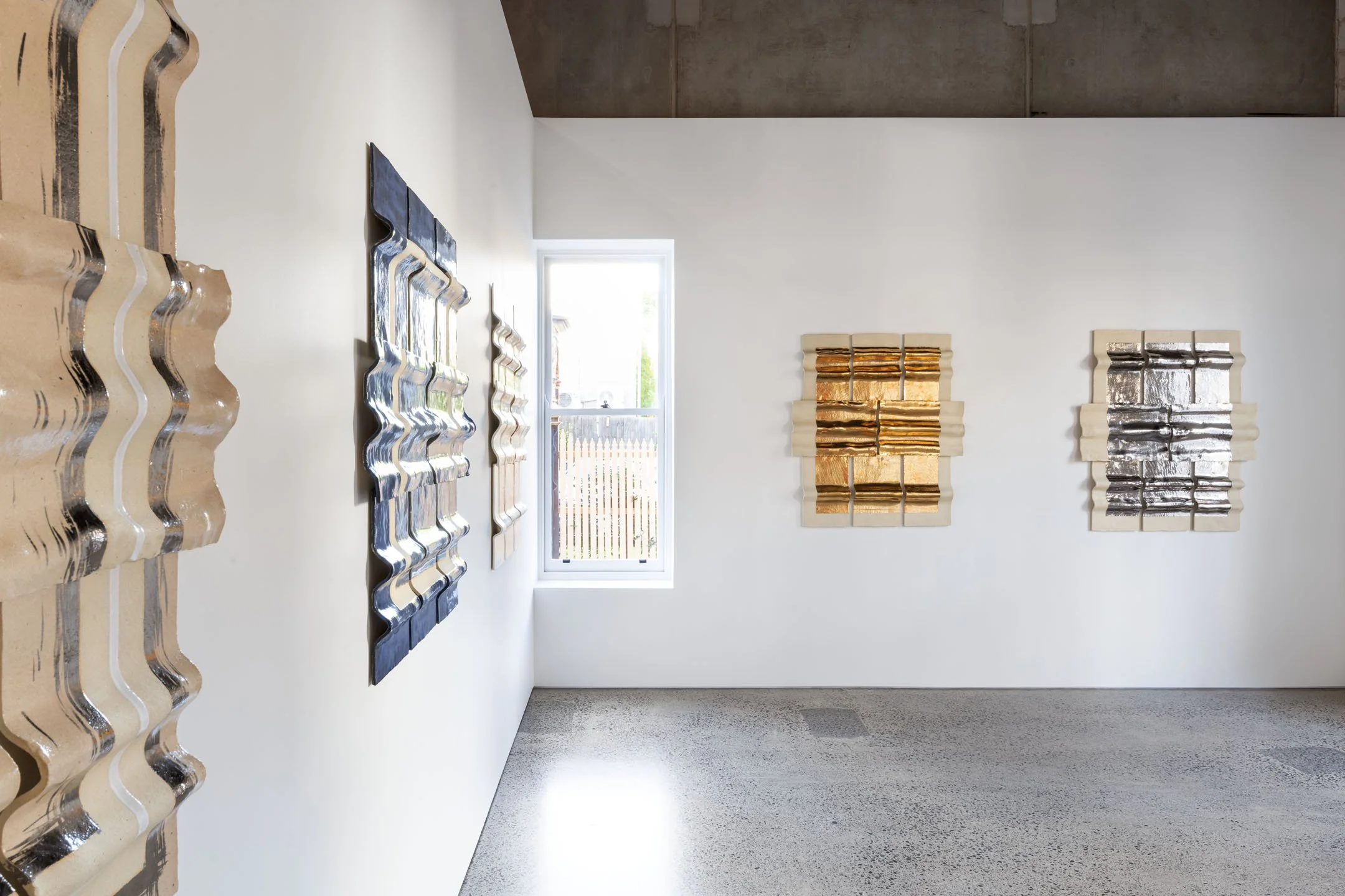 Mazey’s carefully composed yet rough-hewn works capture a wistful beauty in the artist’s practice, tearing away the bubbly optimism of his previous works. Expanding his use of ceramic slabs, the artist has created a range of works in raku and stoneware including ceramic wall “paintings”, free-standing totems, a functionally-lit ceramic lamp and an installation of 9 separate wall works comprising a “petrified wall garden”. Mazey embraces the inherent fallibility and uncontrolled nature of the ceramic medium and successfully balances that in-built naivete with elegant composition and painterly application of platinum and gold lustre.