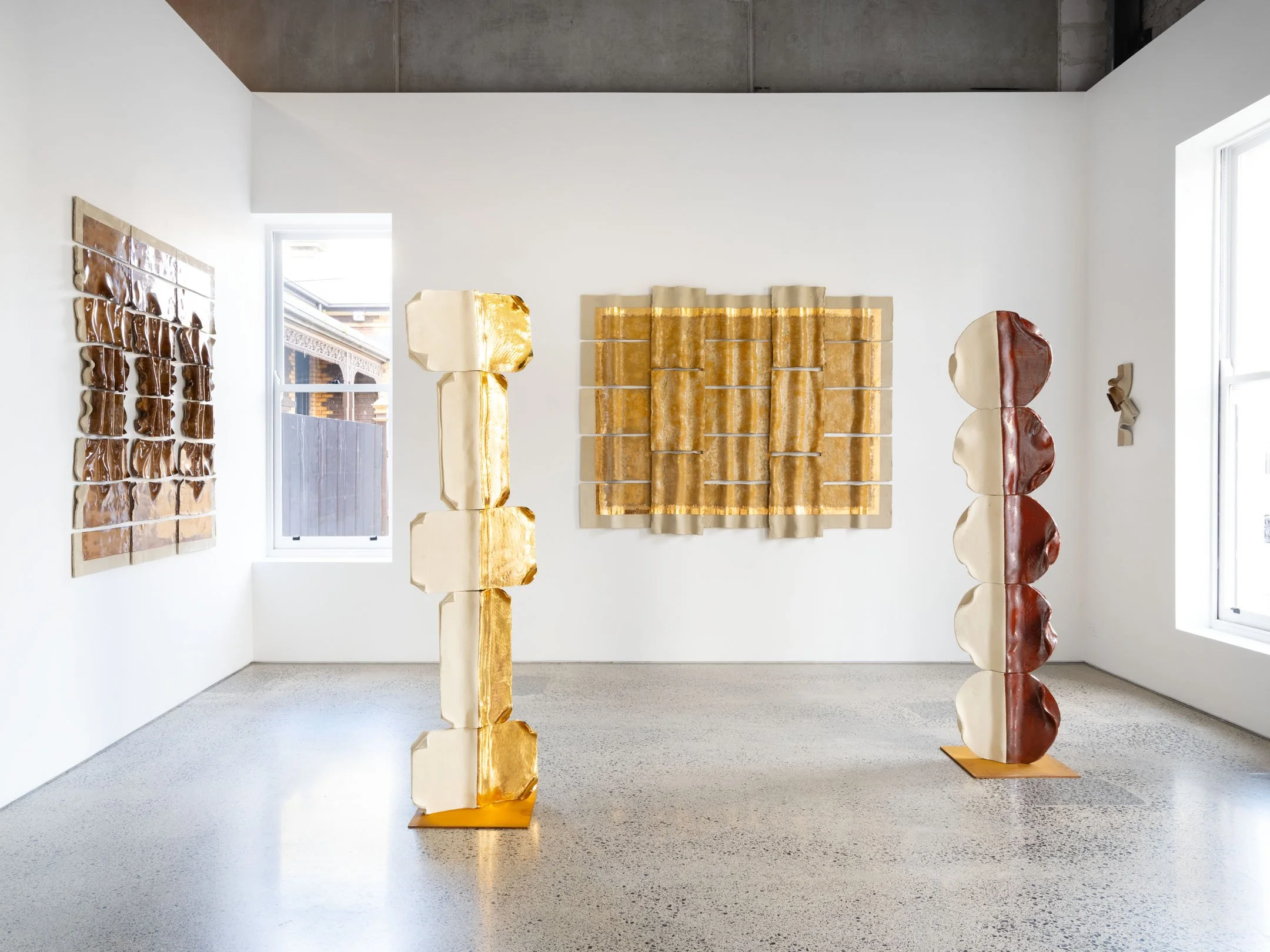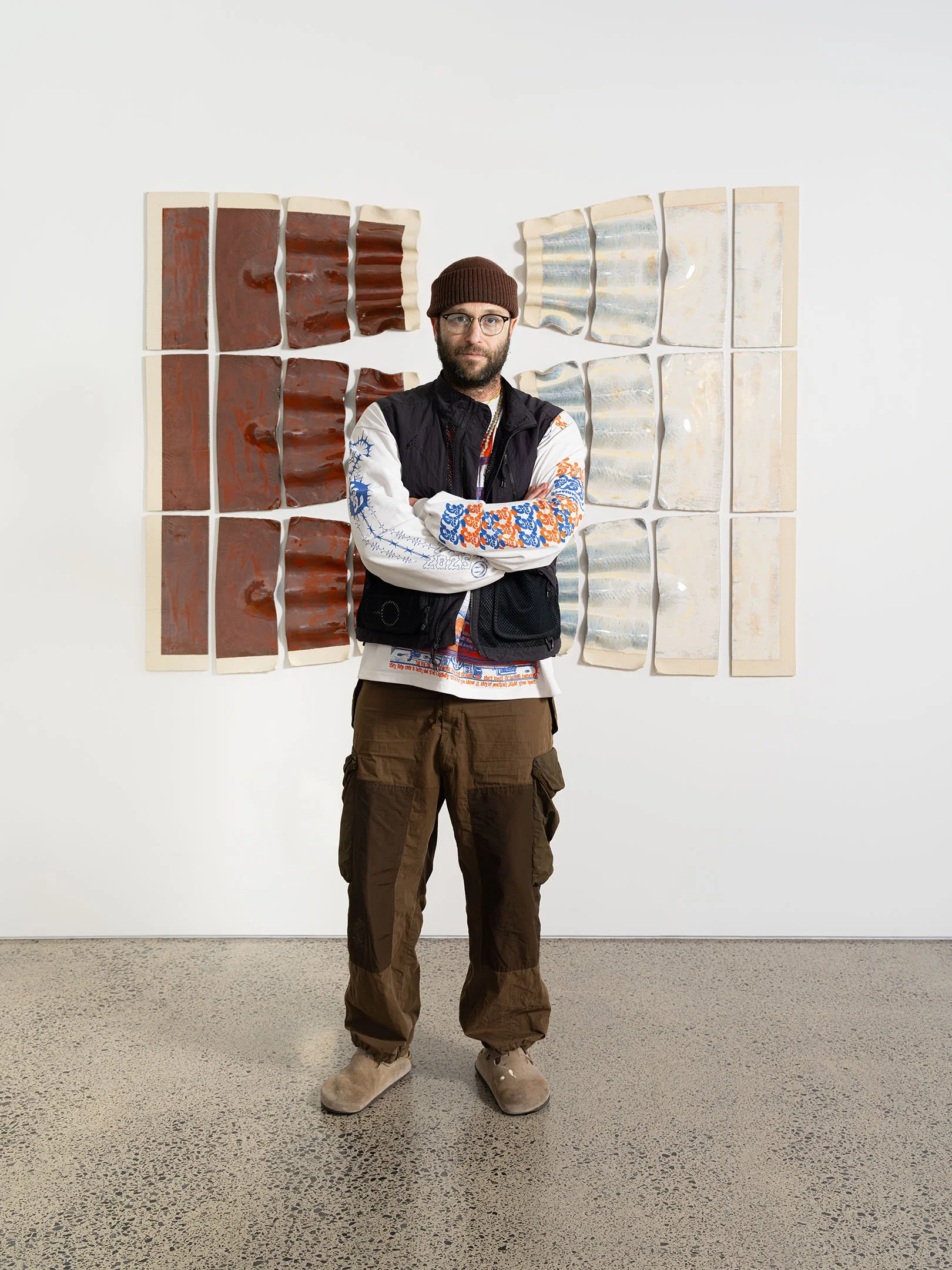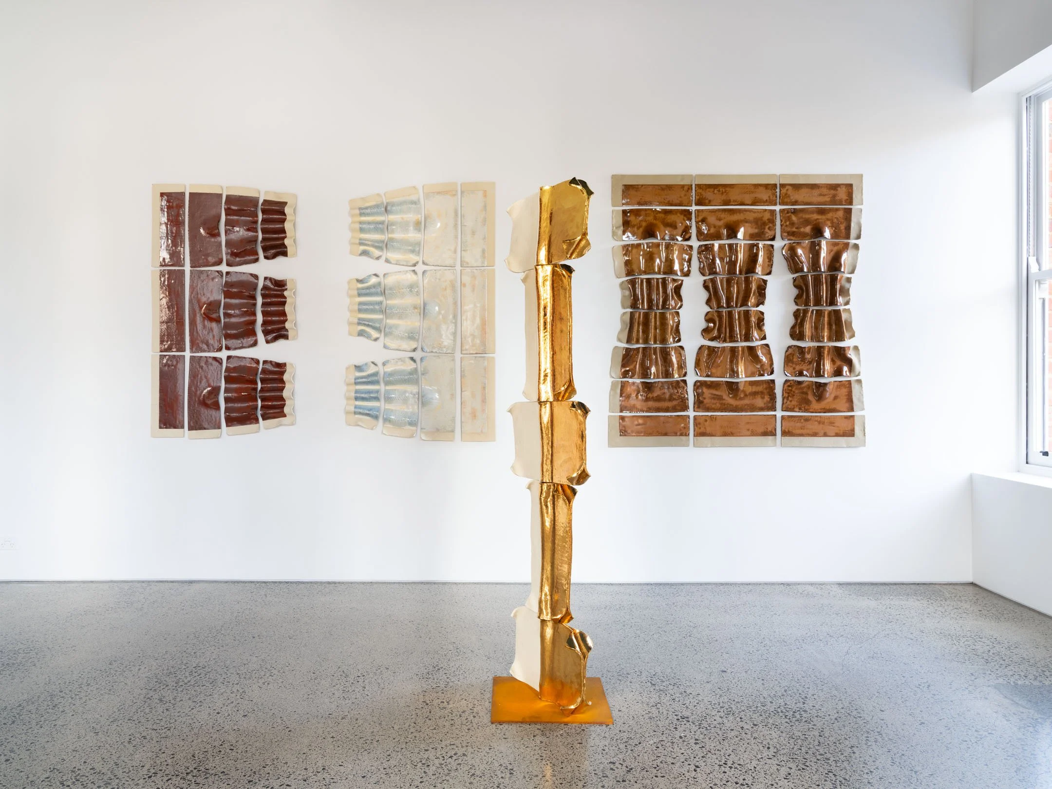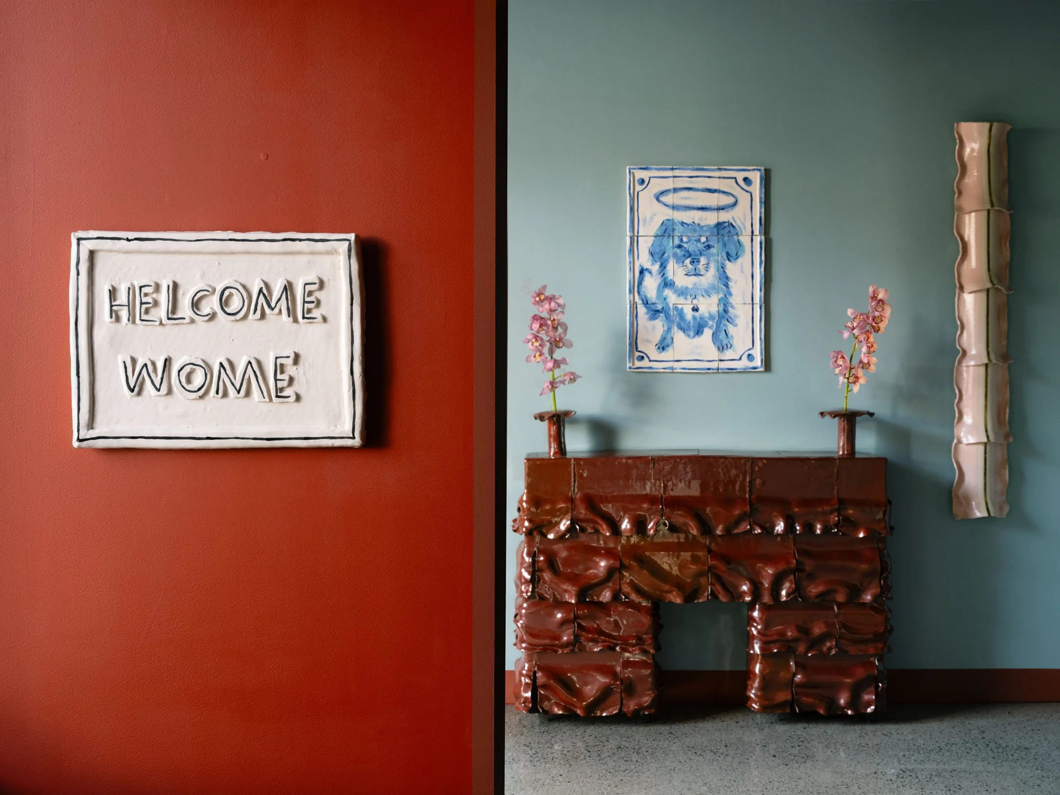 Featuring ceramic wall works, totems and a functional fireplace surround with integrated flower vases, the exhibition showcases a deepened exploration of earlier motifs including Mazey’s “flag” series, delft-style painted works, wall-mounted “word poems” and interpretations, in ceramic, of familiar domestic items.